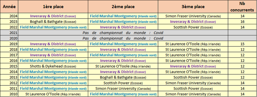 Ci-dessous les résultats des championnats du monde de pipe band en grade 1 depuis 2010.