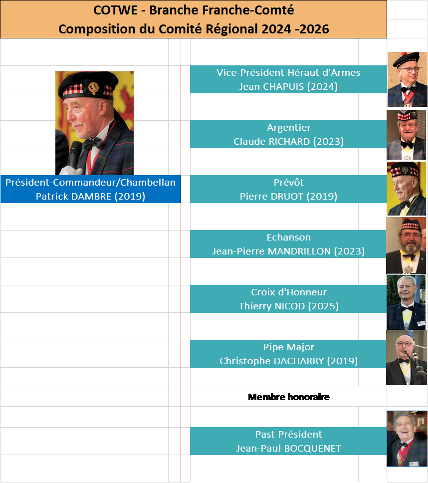 Dans le courant de l'année 2023, deux Past Présidents-Commandeurs (Jean-Paul Bocquenet et Michel Offner), et un Past Vice-Président (Jean Chapuis) ont rejoint l'équipe et lui apporte leur expérience et la pertinence de leurs avis. Ce Comité recomposé exercera ses fonctions jusqu’à l’A.G. de 2026. A cette date, un nouveau Bureau sera élu avec à sa tête un nouveau Président-Commandeur, l'actuel titulaire du poste arrivant au terme du second mandat autorisé par les statuts de la Confrérie.